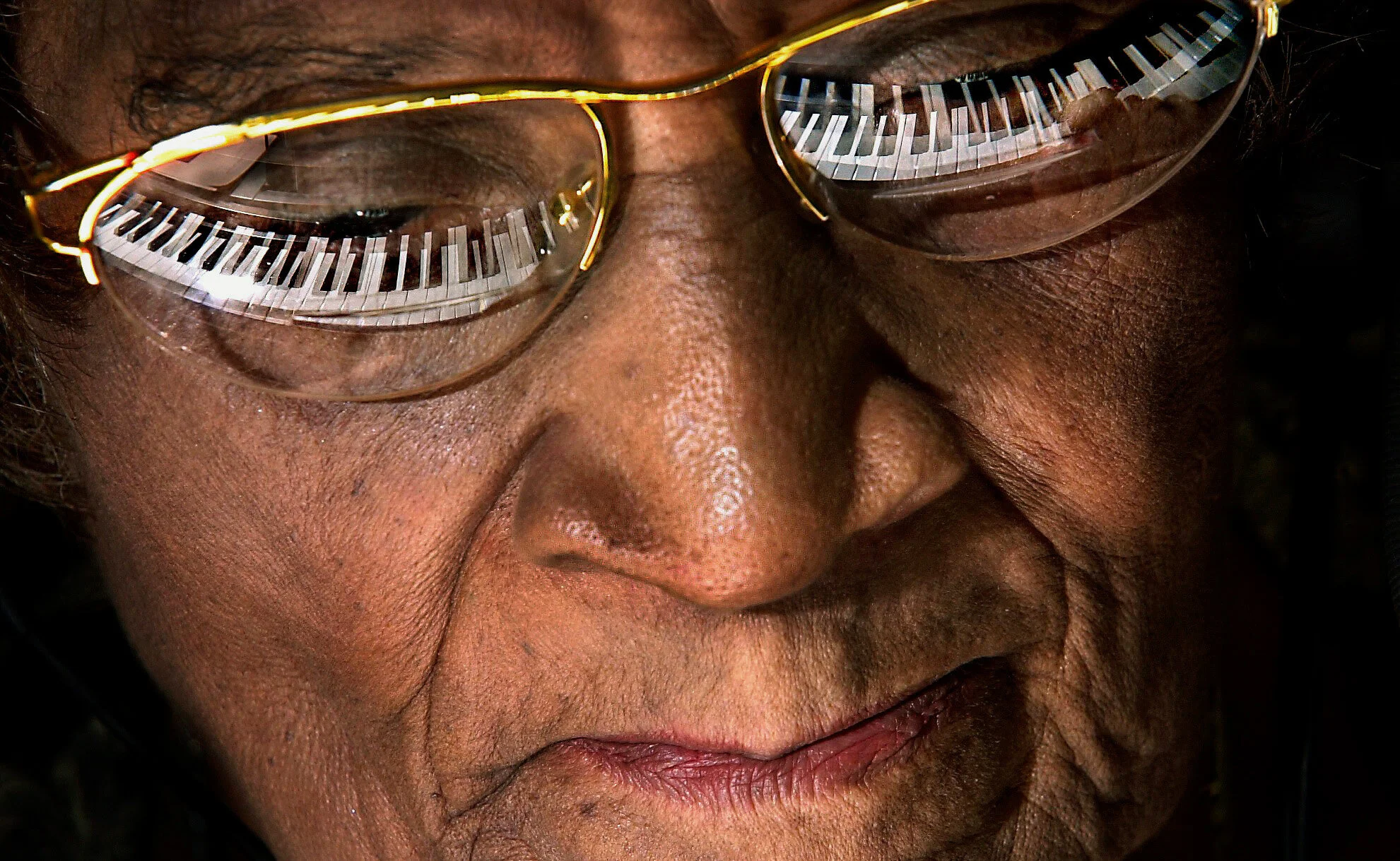 Close-up of an elderly woman's face wearing glasses that reflect piano keys.
